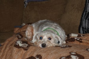 Hope has been out of the puppy mill for nearly two years. I am assuming she is around seven years old now. We are so pleased with her progress. This summer she learned the word “walk” and gets excited when we say, “Do you want to go for a walk?” She learned how to walk properly on a leash long before that. The first time we took her out for a walk she dived under my car and refused to come out. On a walk a few days after that she heard an airplane overhead. She hunkered down and was paralyzed with fear.