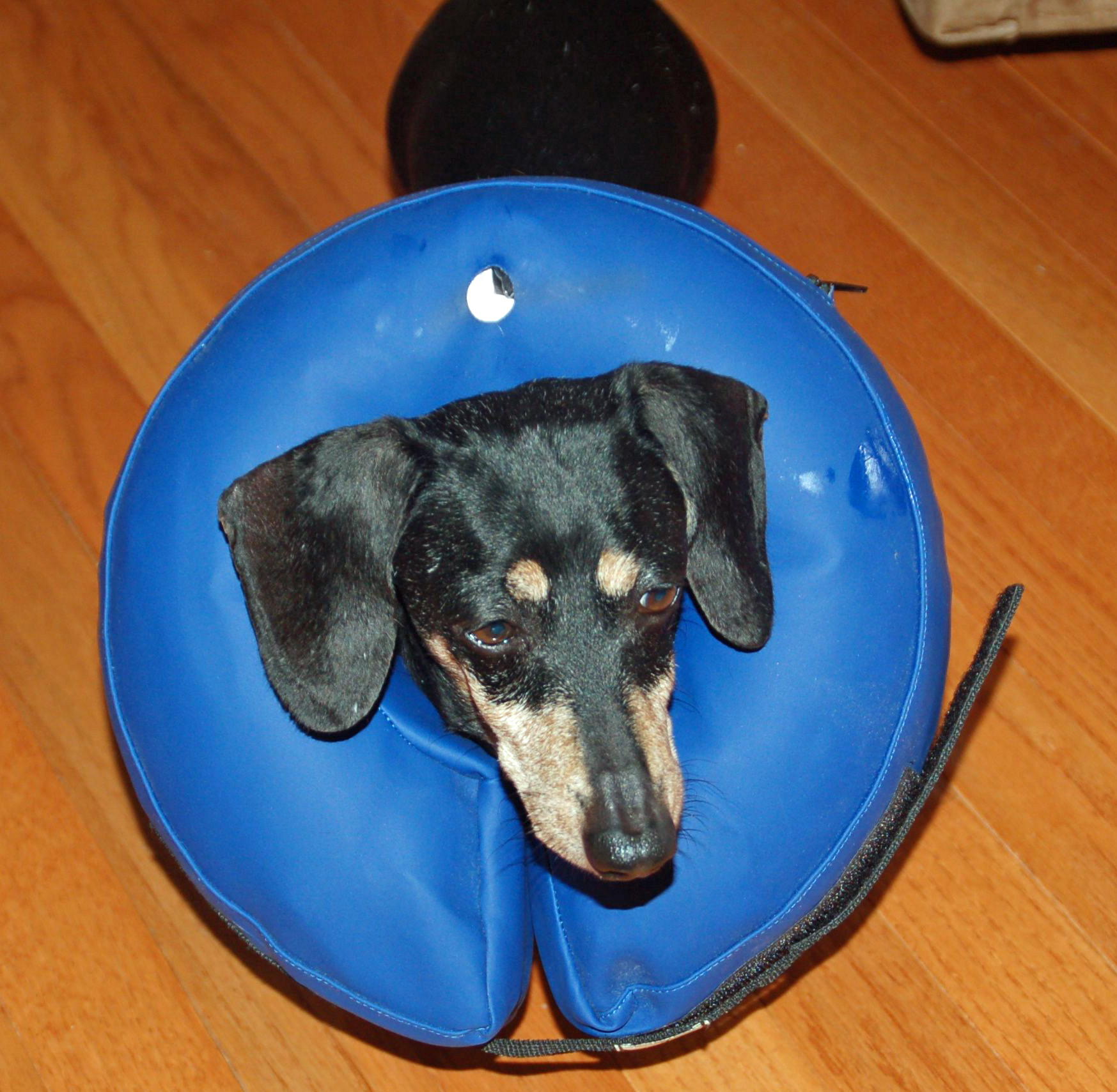 To keep her from licking her incision, I have an inflatable collar. Most vets will give you a plastic cone, known as an Elizabethan collar or e-collar. I found the inflatable one Windy is wearing in a catalog. I think they are more comfortable. She may disagree.