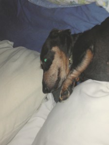 On days I work at home and need to pass through our bedroom to get to the bathroom, Windy will follow, plop down, roll over and wag her tail—all the while next to our bed.
