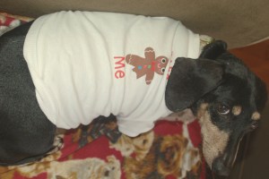 Windy is short on wardrobe, so she got a $2.50 T-shirt with gingerbread man on it with the words “Bite me.” When it is chilly at “walkie” time, I put T-shirts on the wiener dogs because of their short hair. When it is cold, everyone gets a coat on for a walk.