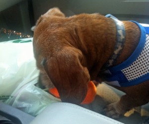 After charming five people in the checkout line, Jake watched me carry the bag with his fish in it. Once in the car, he had to get into the bag.